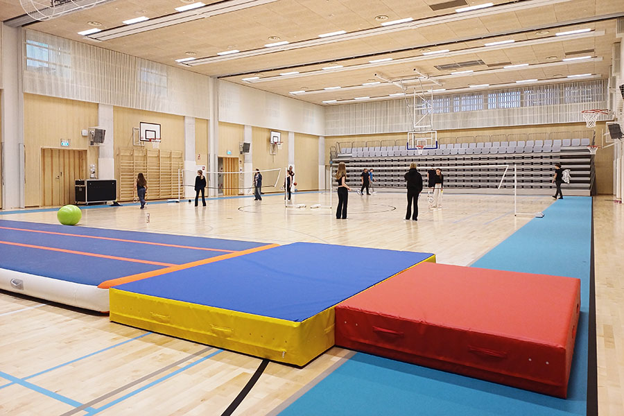Yläkoululaiset tykkäävät viettää välitunteja sisätiloissa hengaillen, ja käytävälle rakennettuihin syvennyksiin kerääntyy kaveriporukoita. Pitkällä ruokavälkällä koulun hieno liikuntasali on auki oppilaille pelailua ja liikkumista varten. Liikuntasali on rakennettu maan alle, mutta luonnonvalo pääsee sinnekin katonrajasta sisään, Hertell osoittaa.