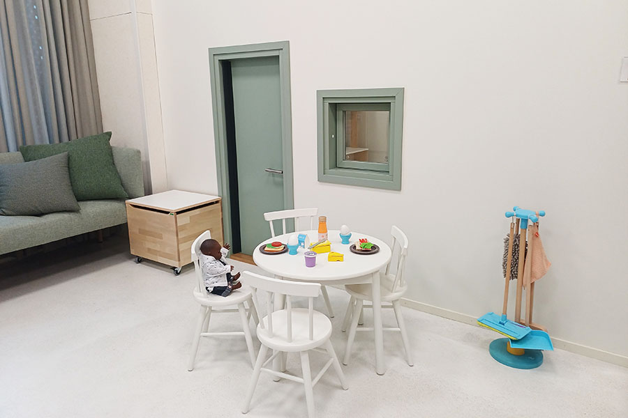 Päiväkodissa on ihania yksityiskohtia kuten lapsen tasolla oleva kurkistusikkuna huoneesta toiseen. Leikkihuoneesta pääsee myös siirtymään päivälevolle viereisen huoneeseen lapsenkokoisesta ovesta.